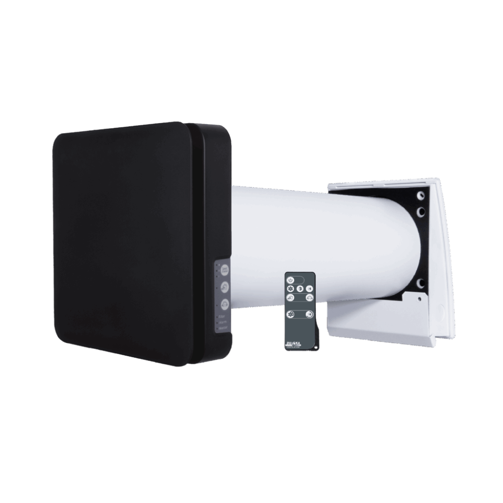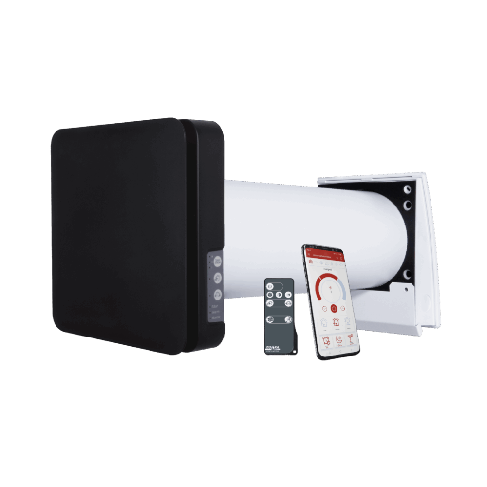 DUKA One Black Edition er en et-rums ventilationsløsning med varmegenvinding, der monteres direkte i ydervæggen. Den udskiller brugt luft og tilfører filtreret frisk luft udefra – samtidig med at den genanvender op til 90 % af varmen fra udsugningsluften.