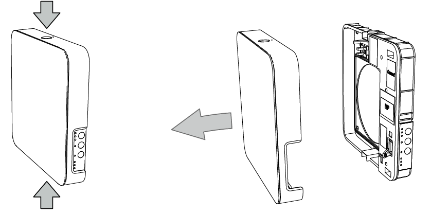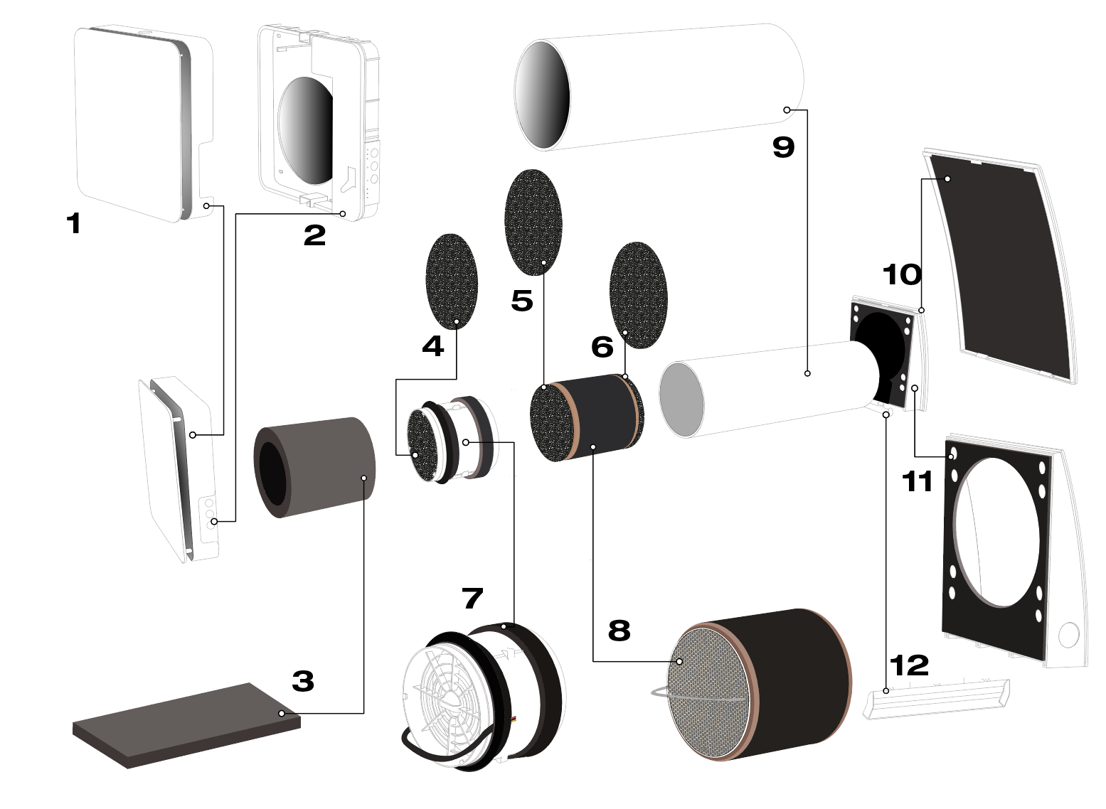 DUKA One enheden består af front cover, elektronikdel, kerne hvor den keramisk veksler og motor er placeret, lyddæmper, filtre, drypplade,