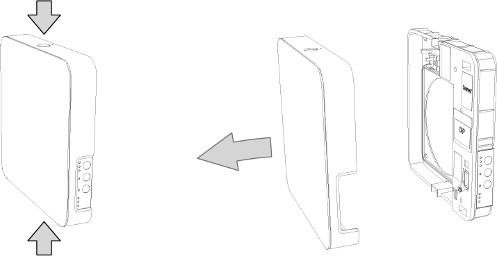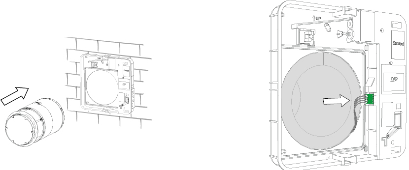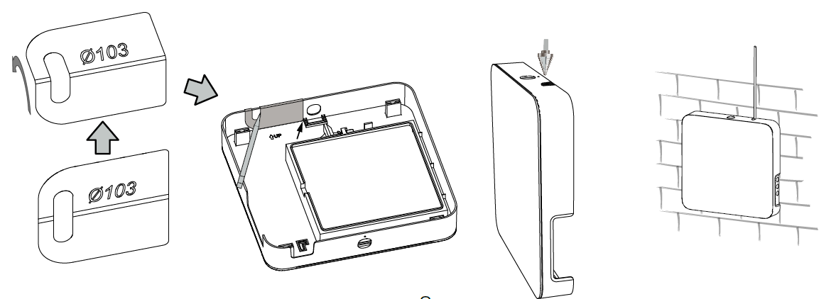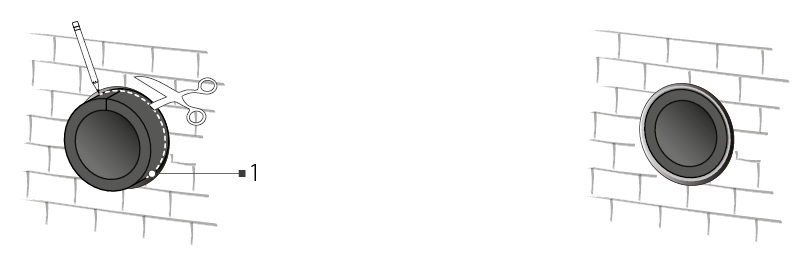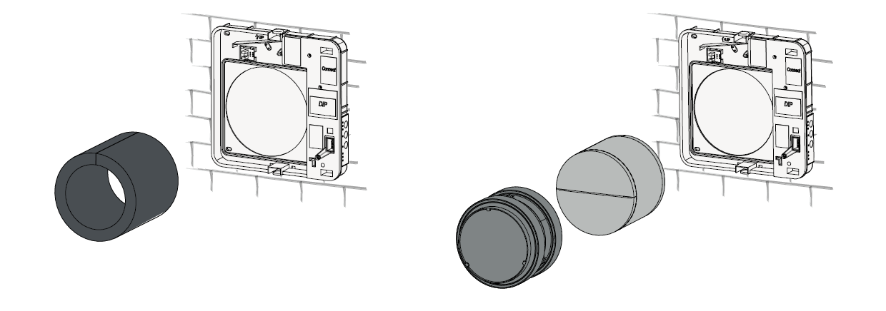 stormskærm samt murgennemføring. På indvendig side sidder elektronikdelen med front cover. I væggen sidder murgennemføringen hvori kernen