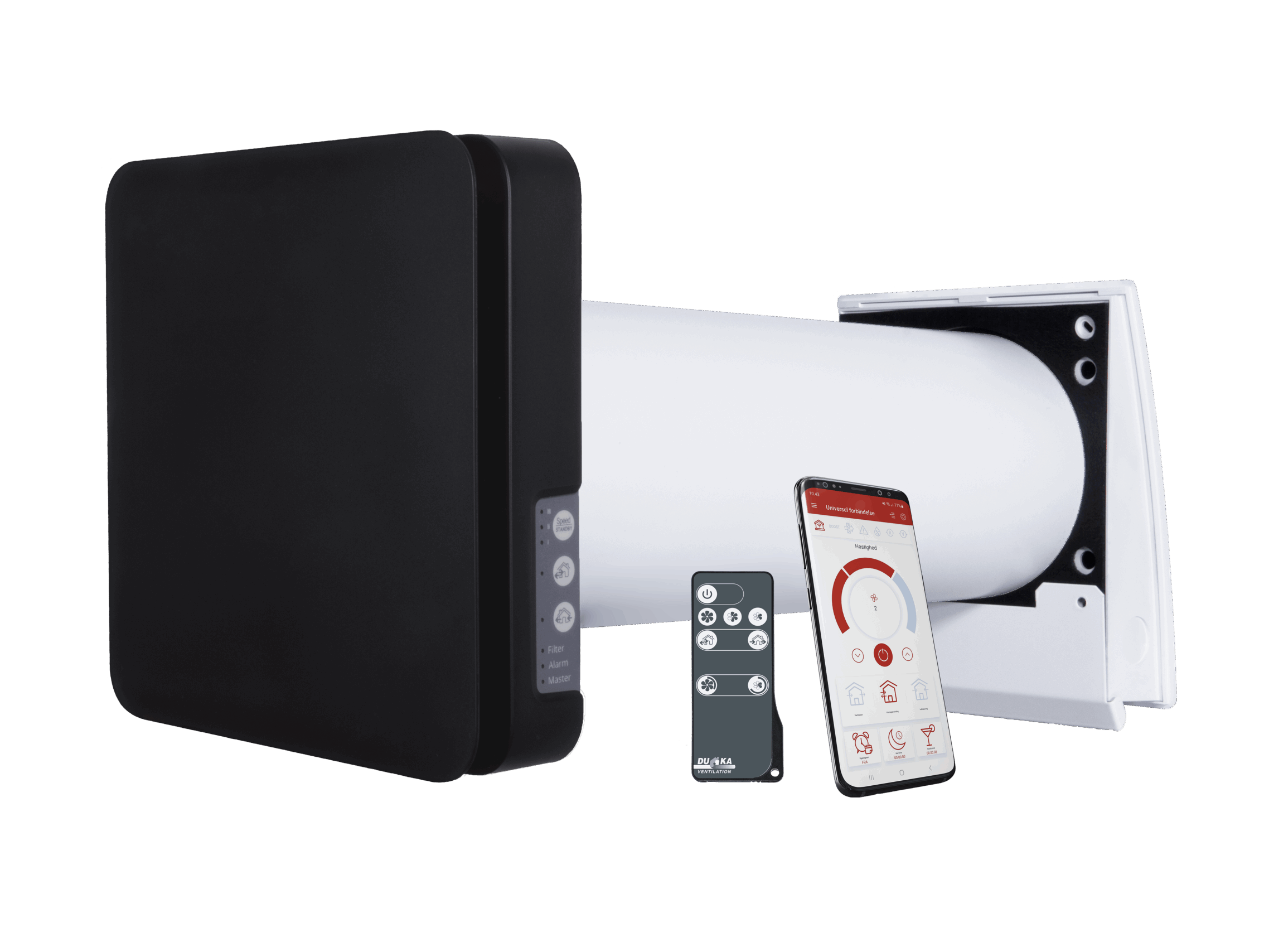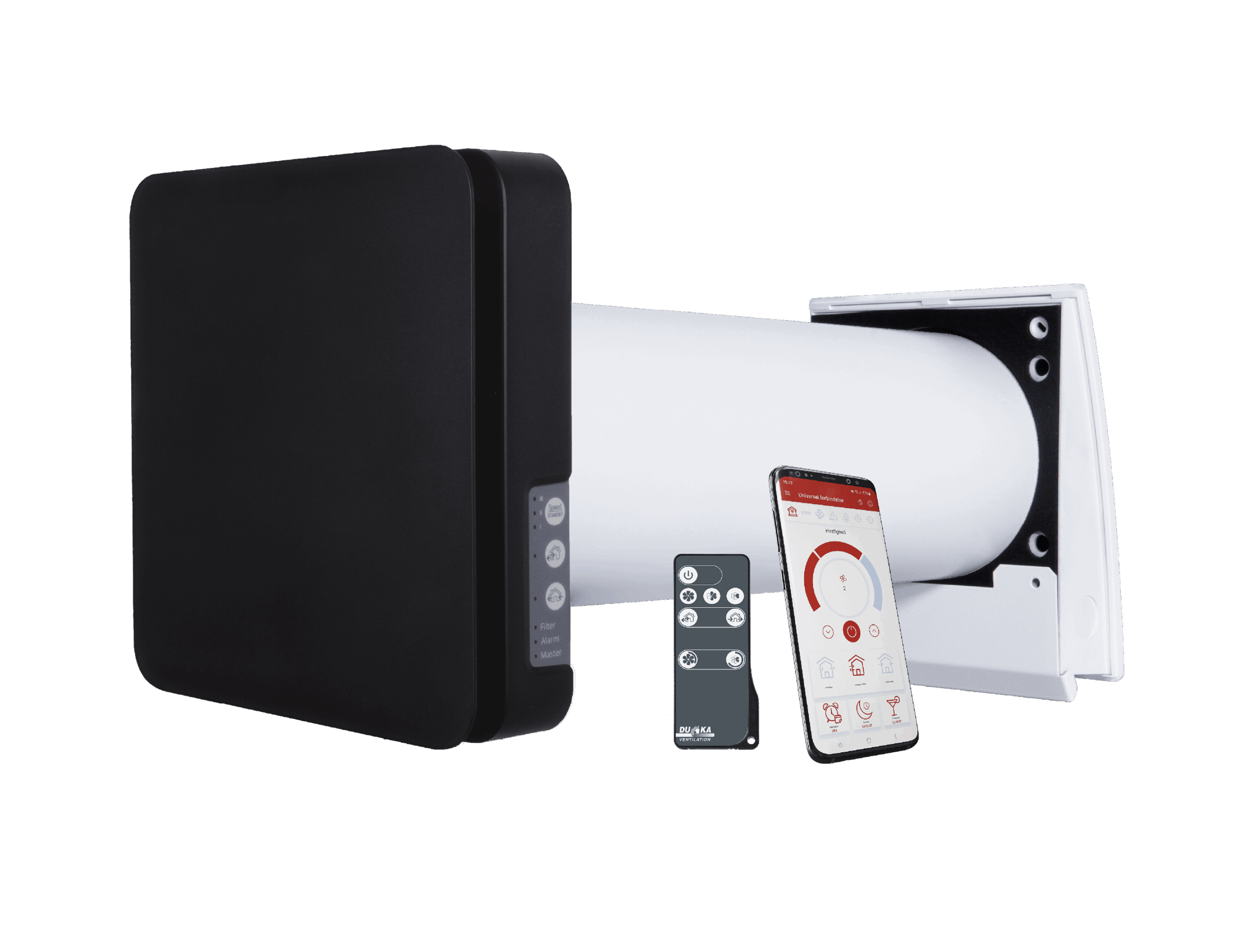 - Læn dig tilbage mens DUKA One klarer indeklimaetDUKA One er udstyret med en intelligent styringsenhed, der gør det nemt for dig at optimere ventilationsprocessen. Styringsenheden kører automatisk mens du vælger luftstrømmen og ventilatorhastigheden for at opretholde den ønskede luftkvalitet og komfortniveau. Den har også indbyggede filtre som bidrager til at forbedre indendørs luftkvalitet og skabe et sundt miljø og indeklima. DUKA One Wi-Fi enheder kan også styres med App. Dette gør det lettere at forbinde flere enheder med hinanden samt indstille ugeprogrammer som passer til dig.