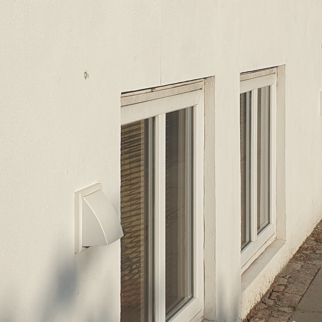 Løsningen består af en murgennemføring med keramisk veksler, udvendig stormskærm og indvendig skærm med lav-energi tovejs-ventilator.