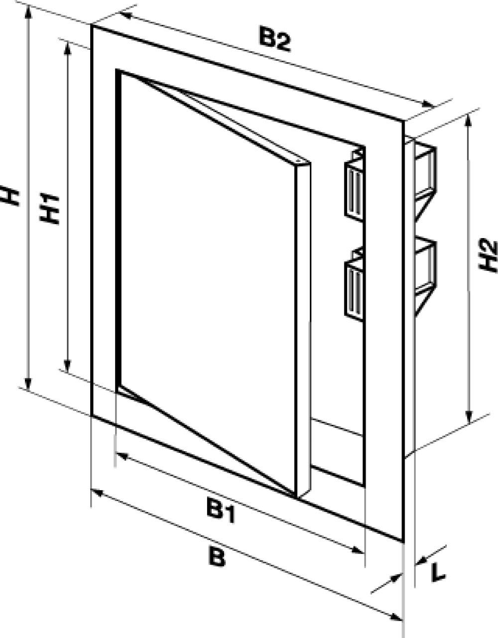 | Størrelse | H | B | H1 | B2 | H2 | B1 | L |