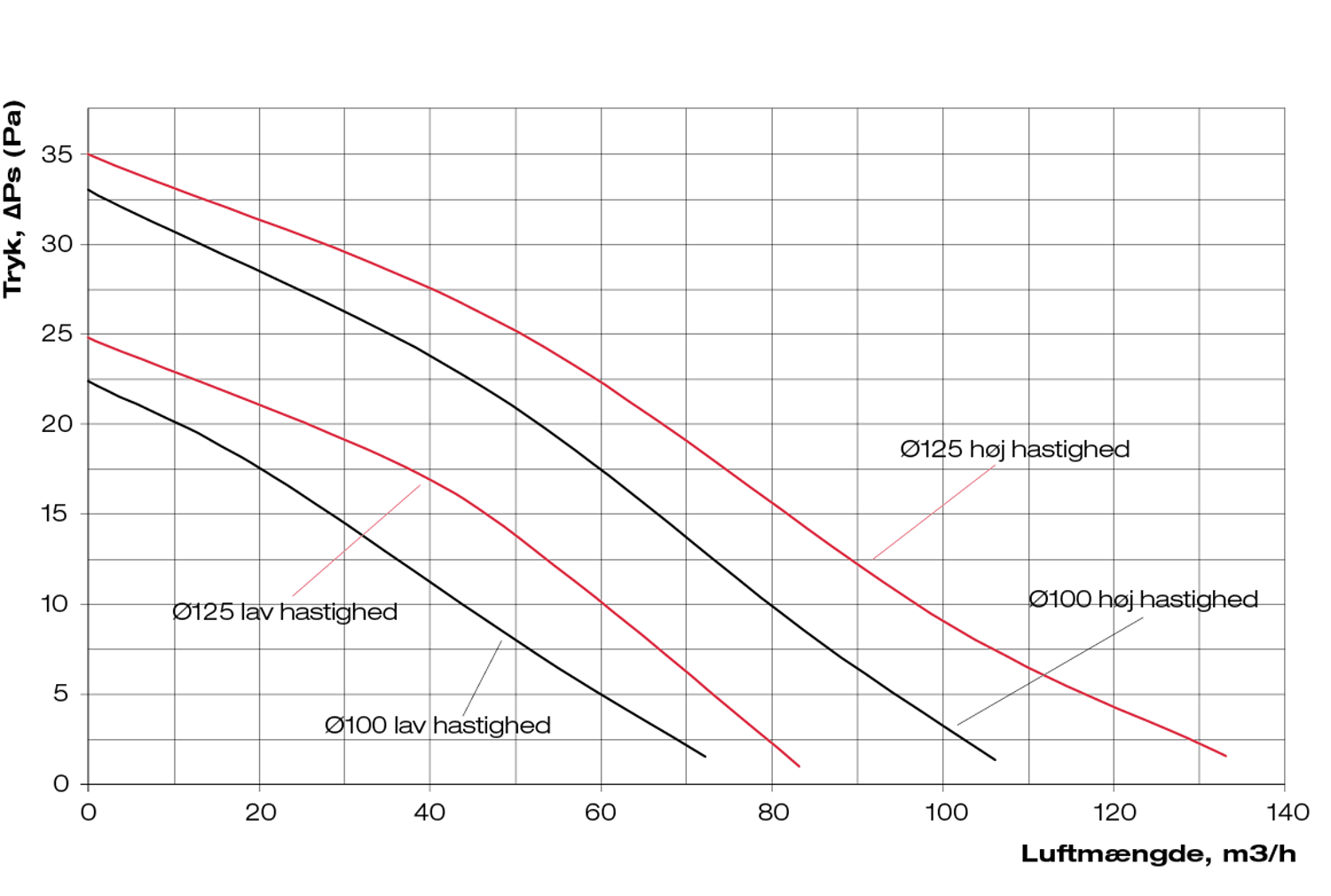 Ventilatoren kan tilsluttes både Ø100 mm og Ø125 mm kanaler.