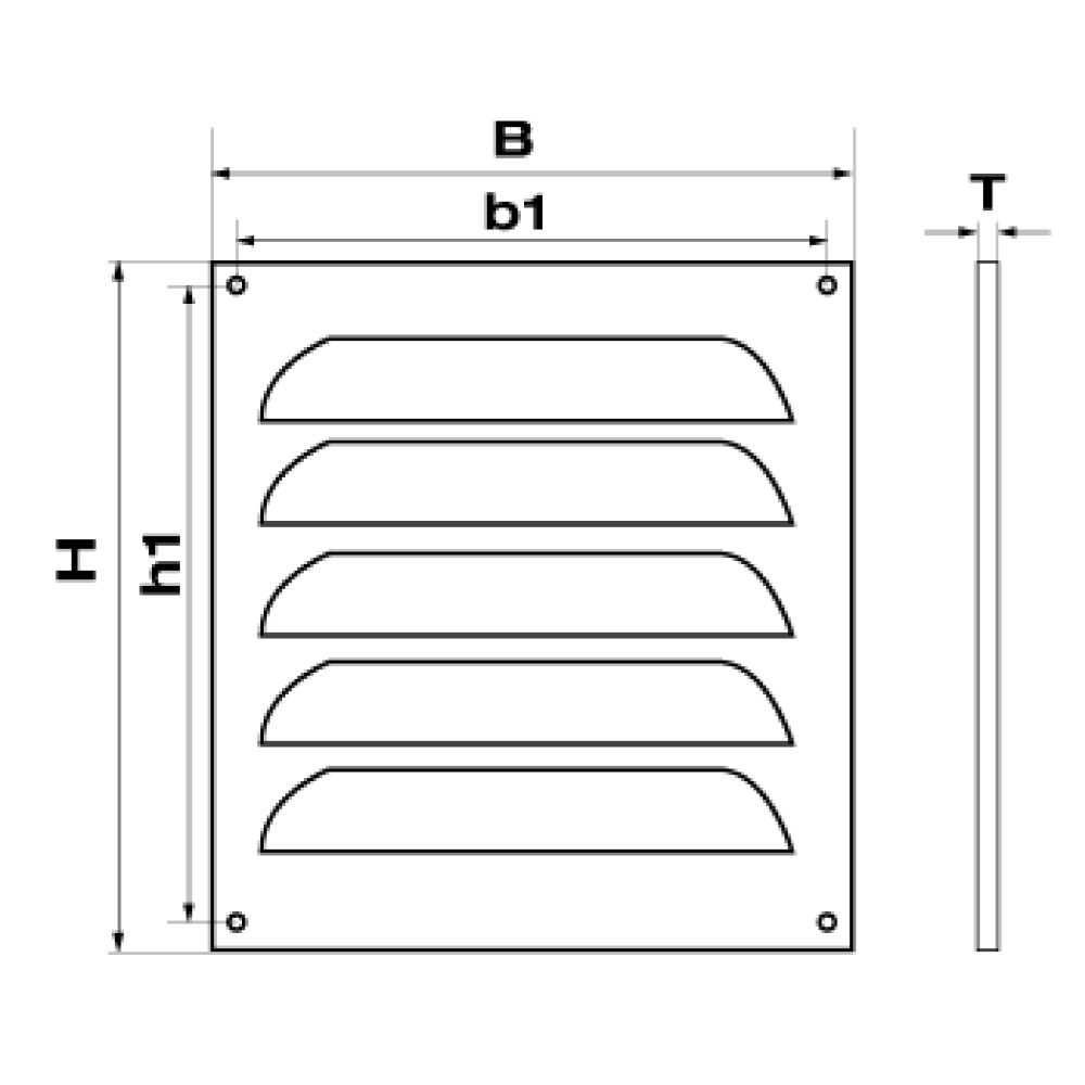 | Type | Dimension | Luftgennemgang | Hulafstand (h1-b1 mm) | Tykkelse (T mm) |